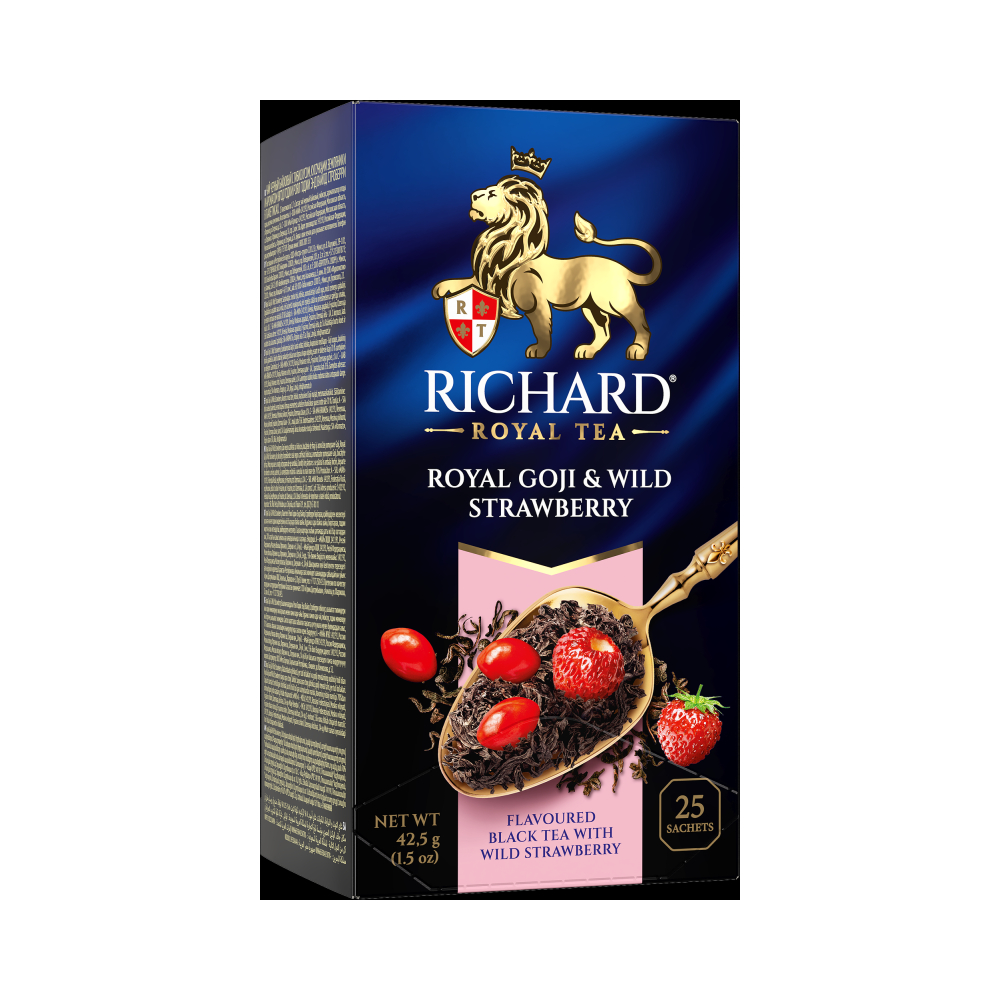 Richard Royal Goji & Wild Strawberry 25 саше × 1.7 г – чай черный ароматизированный с ягодным вкусом. С натуральной земляникой. В индивидуальных конвертиках (саше). Вдохновляющий черный чай с кусочками земляники и ярким ароматом ягод годжи. Освежает и дарит настроение лета.