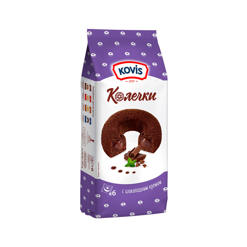 В «Колечках» от Kovis в лучших традициях российских кондитеров лёгкость основы отлично сочетается с сочностью начинки. В тщательно подобранных пропорциях гармонируют сочный бисквит с легкой тающей текстурой и приятно-сладкая начинка. Лакомство удобно взять с собой и оно способно создать повышенное настроение на весь день. Продукт по своей универсальности можно считать уникальным для отечественного рынка. Благодаря продуманной индивидуальной прозрачной упаковке, вкусовым и питательным качествам его можно с удовольствием подать к домашнему чаепитию, выставить на открытом пикнике или взять с собой для быстрого перекуса.