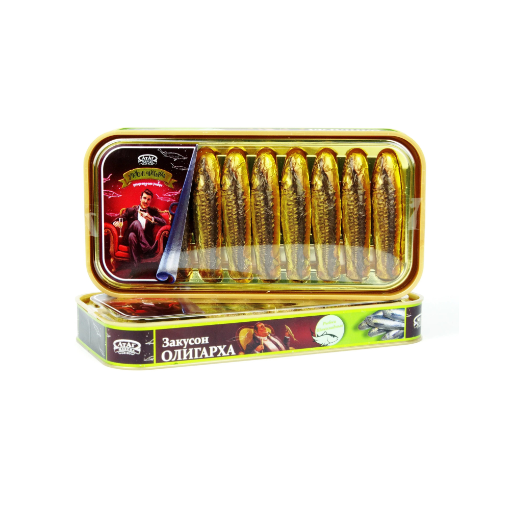Шоколадные конфеты-рыбки с пралиновой начинкой, как золотые осётры для особого случая – отличный сладкий подарок. Удивить и порадовать друзей очень просто с конфетами «Закусон олигарха» и для этого не требуется много денег. Презент оформлен в виде банки с прозрачным верхом, размер 19 х 9,5 х 2,5 см.