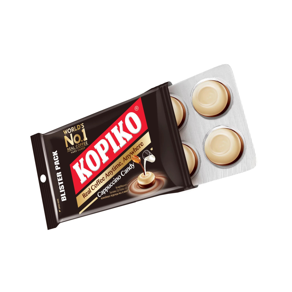 Леденцы KOPIKO, содержащие настоящий кофейный экстракт из лучших индонезийских вулканических кофейных зерен, признаны брендом №1 в мире. Бренд KOPIKO с каждым годом завоевывает свою популярность в разных уголках мира и на данный момент представлен в более чем 80 странах. Яркий натуральный вкус и естественный аромат леденцов покорит сердца самых взыскательных ценителей кофе. Кофеин и высокое содержание глюкозы пробуждают и поддерживают заряд энергии весь день. Употребление 4 конфет способно заменить чашку эспрессо.