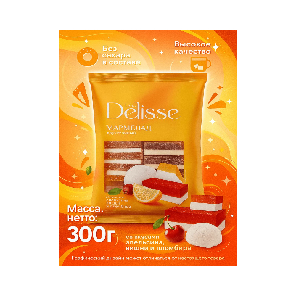 Мармелад DELISSE двухслойный – это сладкое угощение, которое предлагает разнообразие вкусов апельсина, вишни и пломбира. Каждый двухслойный кусочек радует своими насыщенными и яркими вкусами, создавая веселую и сладкую атмосферу для их наслаждения.