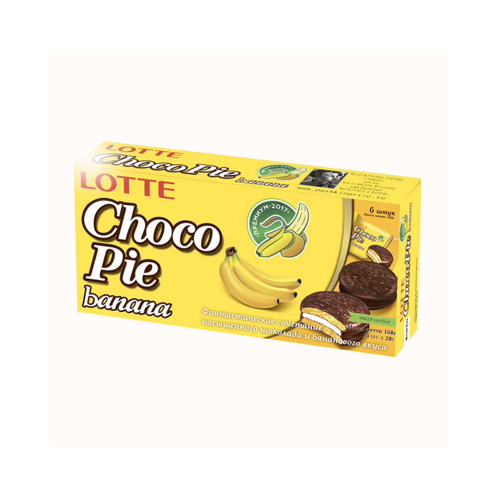 Необыкновенный десерт с прослойкой из маршмеллоу и шоколадной глазурью. Обладает восхитительным вкусом и тонким ароматом. Банановые пирожные ChocoPie от торговой марки Lotte понравятся взрослым и детям и превратят в праздник любое чаепитие.