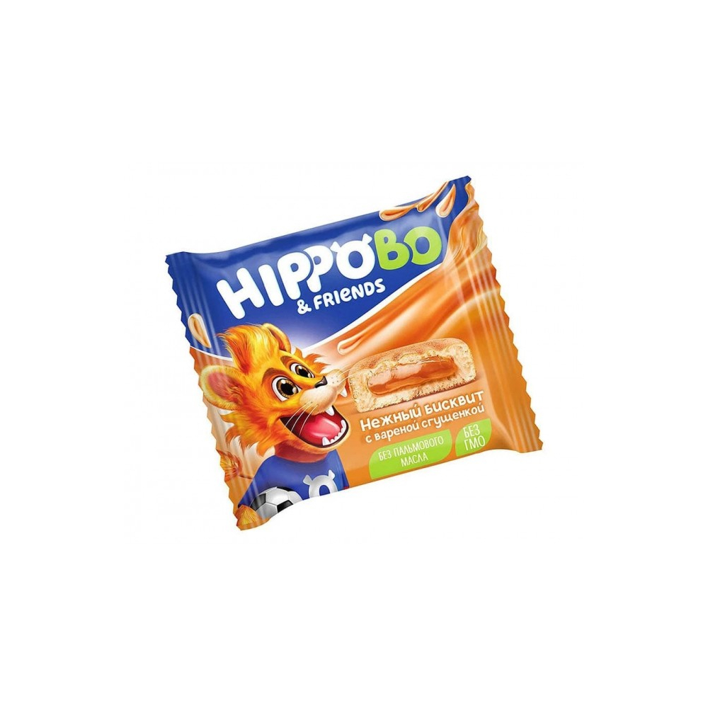 По-домашнему вкусные бисквитные пирожные с вареной сгущенкой. Герои HIPPO BO & friends – Бегемотик Бо и его озорные друзья Обезьянка, Львенок и Слоненок. Под упаковкой может притаиться любой из них. А если форма пирожного совпала с персонажем с упаковки? Сегодня твой день!