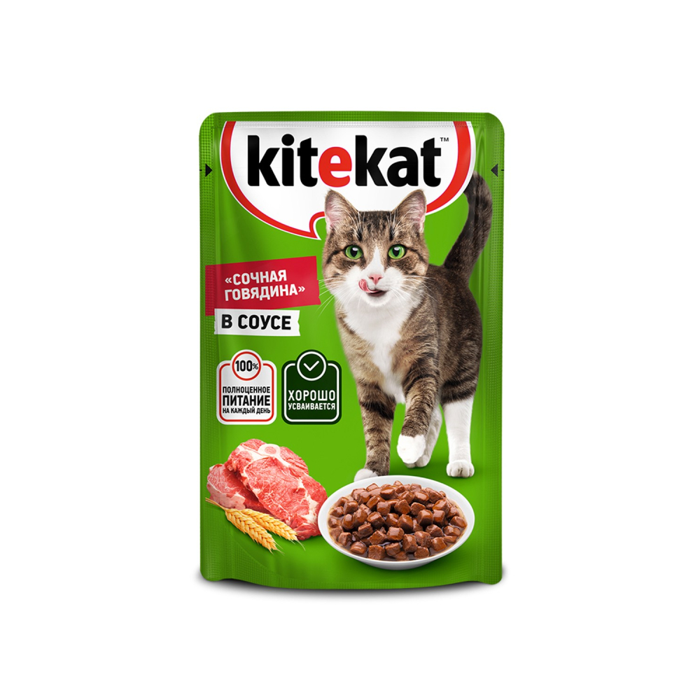 Kitekat™ «Сочная говядина в соусе» — полноценное питание для кошек на каждый день. Текстура соуса придает особенно сочный вкус кусочкам говядины. Корм Kitekat™ создан из высококачественных ингредиентов и содержит все необходимые для здоровья питомца полезные элементы — белки, жиры, витамины (D3, B5, B6, и др.), минералы (кальций, фосфор, магний и др.), таурин, полезные жиры и масла — в правильном соотношении, подобранном профессионалами. За счет клетчатки корм поддерживает здоровье пищеварительной системы, а благодаря сбалансированному составу — подходит и для стерилизованных кошек. Для оптимального контроля веса питомца и заботы о здоровье его ротовой полости рекомендуется сочетать влажный корм с сухими рационами Kitekat™. Качество Kitekat™ проверено временем — это источник жизненных сил и энергии для многих поколений кошек! Содержание питательных веществ (100 г): белки - 6,0 г; жиры - 3,5 г; зола - 2,5 г; клетчатка - 0,3 г; витамин А - не менее 150 МЕ; витамин Е - не менее 0,9 мг; влага - 84 г. Энергетическая ценность (100 г): 65 ккал / 272 кДж. Рекомендации по кормлению Для взрослой кошки среднего веса (4 кг) требуется 3 - 4 упаковки в день. Вашу кошку следует кормить кормом комнатной температуры. После вскрытия упаковку хранить при температуре от +2 °С до +8 °С, использовать в течение суток. Декларация о соответствии Certificate Number РОСС RU Д-RU.РА01.В.00351/22 Certificate Issue Date 2022-01-12 Certificate Expiry Date 2025-01-11