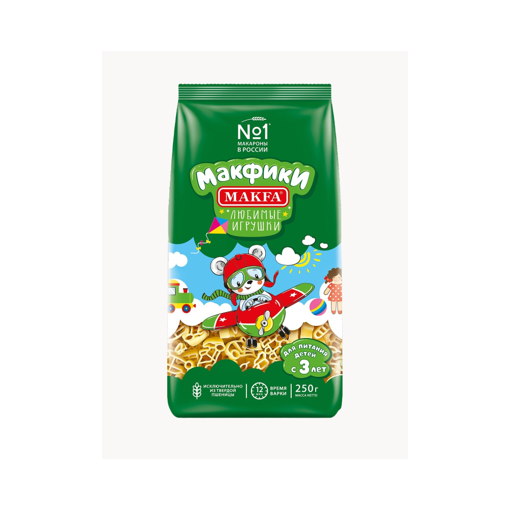 Накормить капризулю никогда не было так просто! Наши макаронные изделия из твердой пшеницы «Макфики» сделаны в виде веселых игрушек: паровозики, принцессы, машинки, самолетики, мишки, мотоциклы, — понравятся и мальчишкам, и девчонкам. Бронзовая матрица помогает создать у макаронных изделий особенную поверхность, которая лучше удерживает соус. Аль денте 10 минут, до готовности 12 минут.