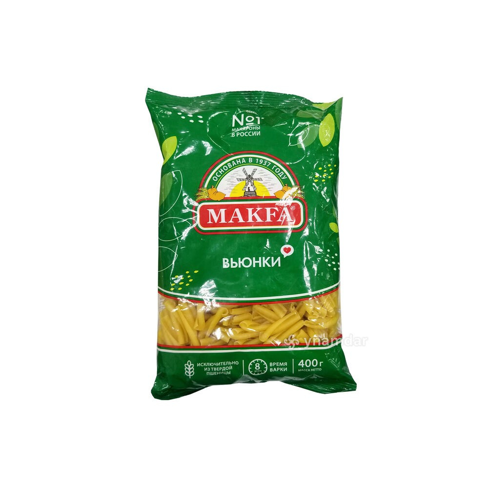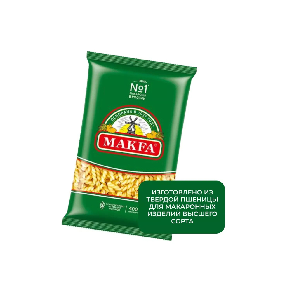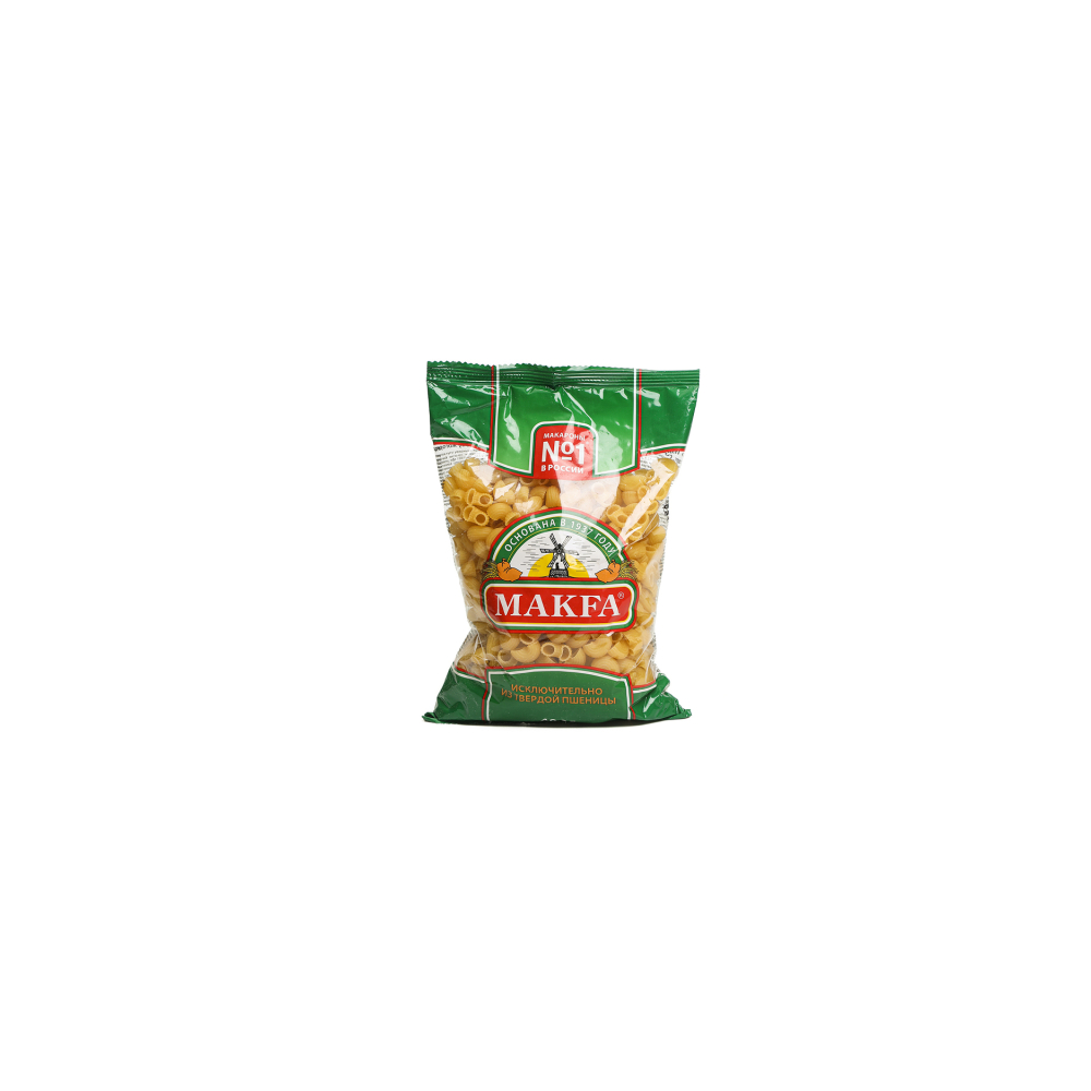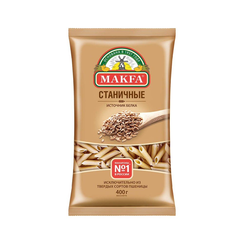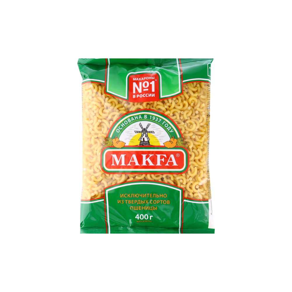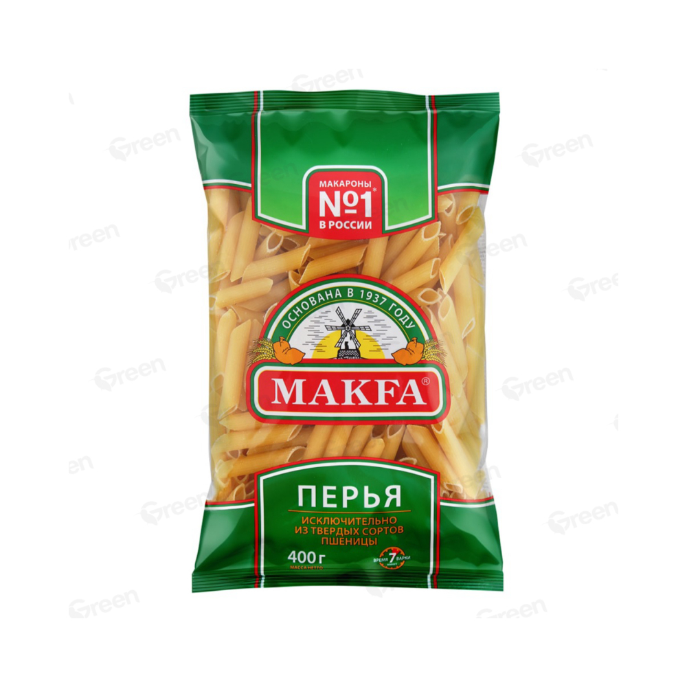 Макароны «Макфа» сделаны из муки твердых сортов, содержащей чуть меньшее количество клейковины, чем обыкновенная мука. Она хорошо поглощает воду, макароны из нее при варке увеличиваются и не развариваются. Форма — перья, в упаковке 400 г. Состав продукта: мука из твердой пшеницы для макаронных изделий высшего сорта, вода питьевая. Без пищевых добавок и красителей. Не содержит ГМО.