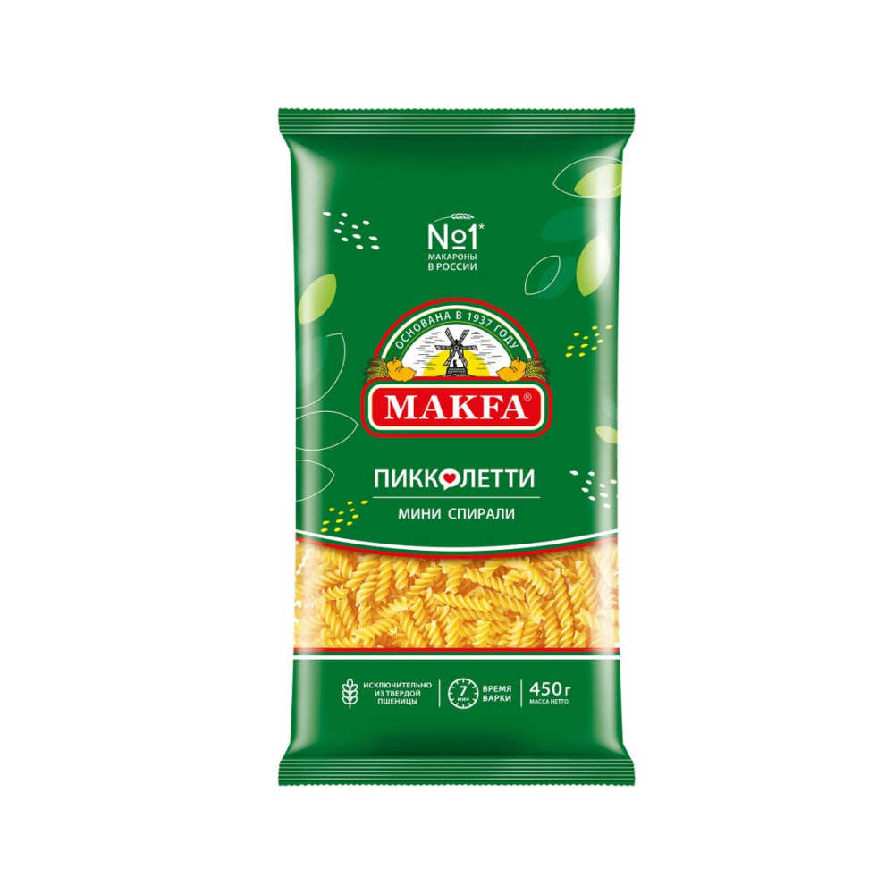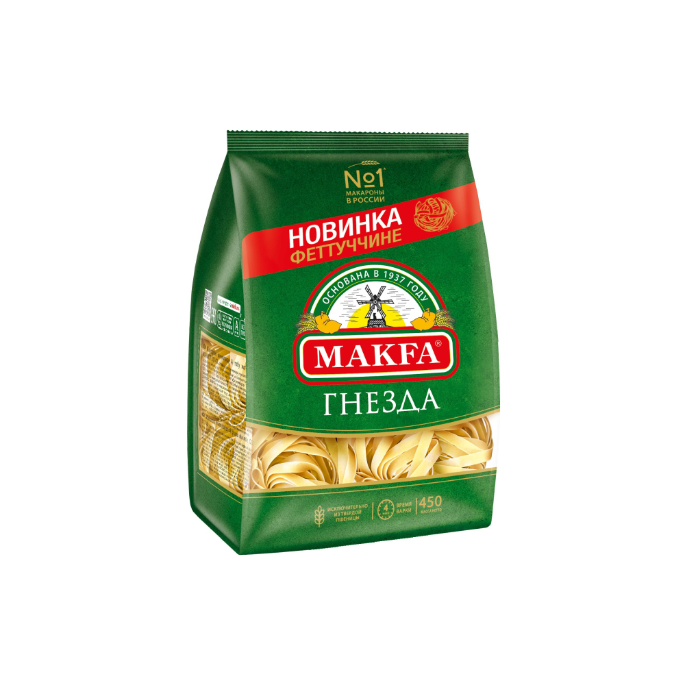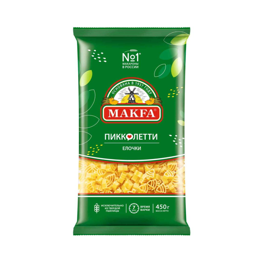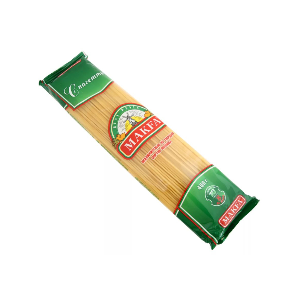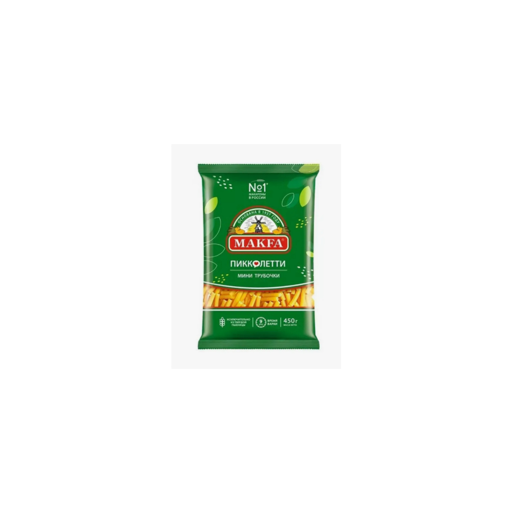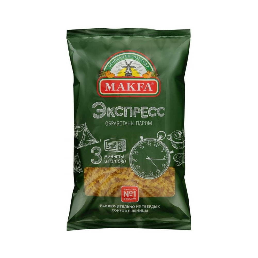 Макароны «Макфа» сделаны из муки твердых сортов, содержащей чуть меньшее количество клейковины, чем обыкновенная мука. Она хорошо поглощает воду, макароны из нее при варке увеличиваются и не развариваются. Форма — перья, в упаковке 400 г. Состав продукта: мука из твердой пшеницы для макаронных изделий высшего сорта, вода питьевая. Без пищевых добавок и красителей. Не содержит ГМО.