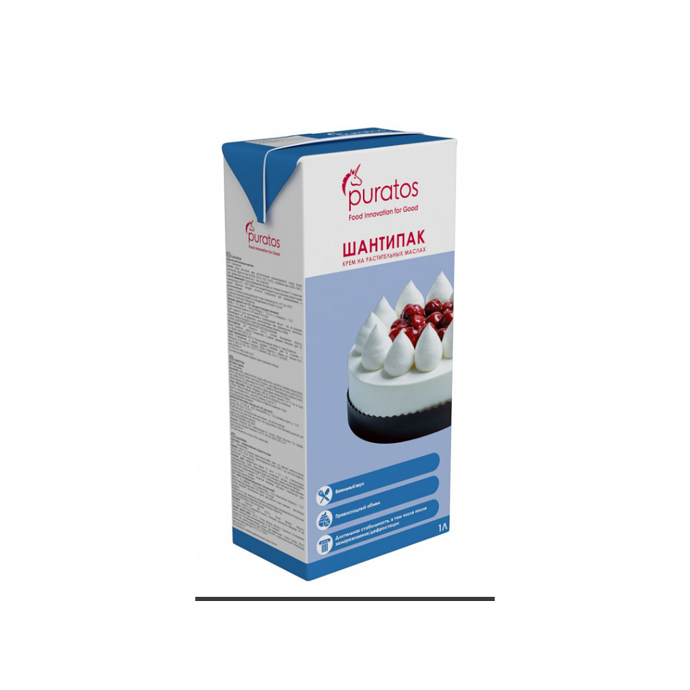 Крем Шантипак – сливки растительного происхождения жирностью 27%. Взбитые сливки Шантипак хорошо держат форму, менее чувствительны к перепадам температур и механическим воздействиям. Их можно использовать для приготовления всех видов кондитерских изделий.