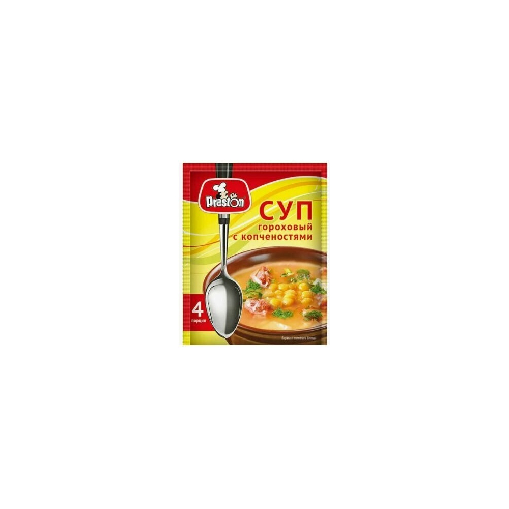 Preston Суп гороховый с копченостями, 60 г. Суп гороховый с копчёностями “Preston” – высококачественный готовый продукт, созданный в традициях русской национальной кухни, что позволит Вам приготовить знакомый и любимый всеми суп без использования дополнительных ингредиентов. Исторически так сложилось, что супы в нашей жизни составляют основу питания. Мы так к ним привыкли, что представить обед без них невозможно, да и зачем? Горячие жидкие блюда очень полезны для организма и в некоторых ситуациях просто незаменимы. А может ли суп, приготовленный за 10 минут, стать полноценным обедом? Конечно, да! Если это суп от pr.Preston. Это сочетание отборных сушеных овощей, трав и специй. Одного пакетика хватит на целую семью! Способ приготовления: 1. Содержимое пакета залить 0,8–1,0 л (4–5 стаканов) горячей воды. 2. При помешивании довести до кипения и варить 20–25 минут.