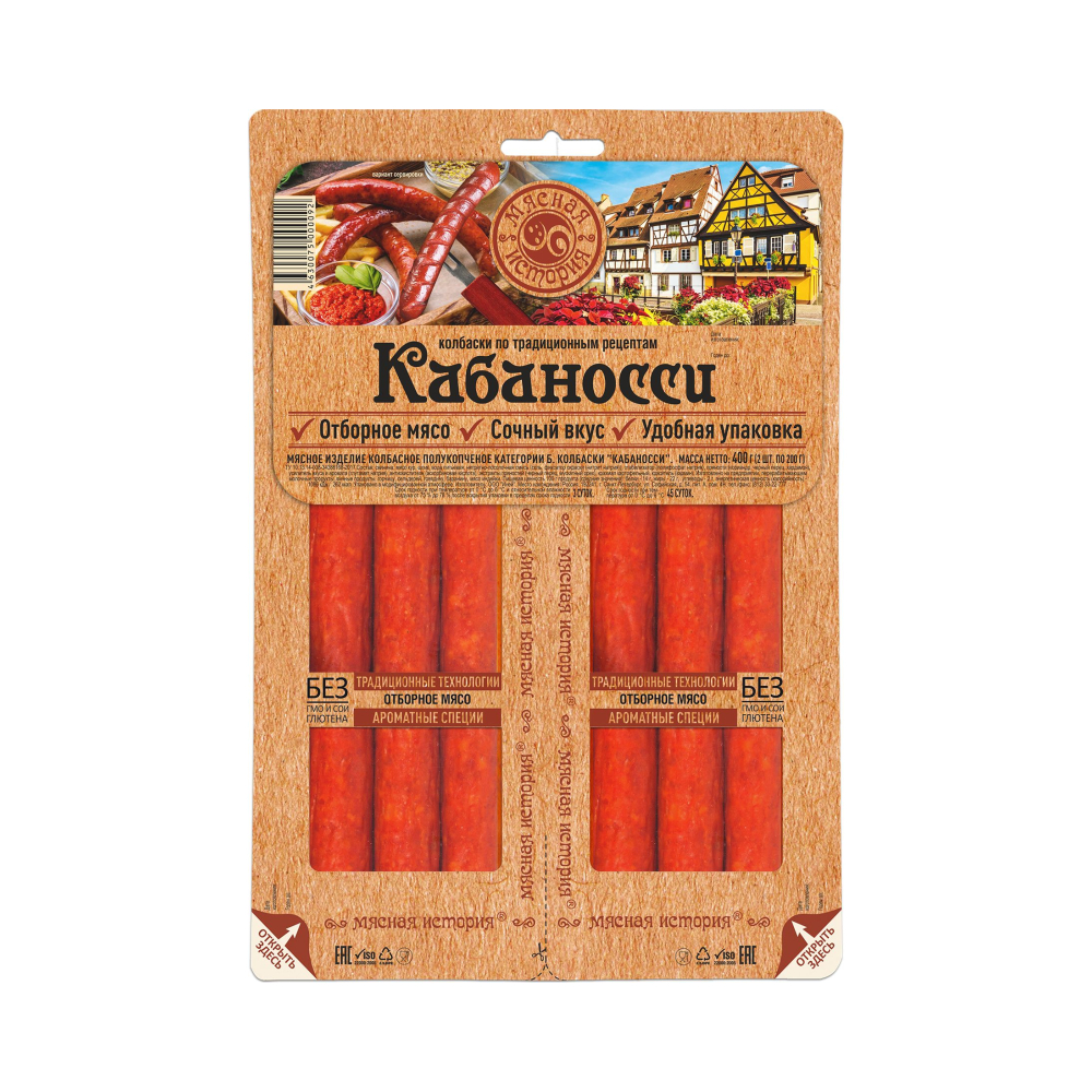 Колбаски полукопченые МЯСНАЯ ИСТОРИЯ Кабаносси изготовлены по классическим и оригинальным рецептам. Яркий мясной вкус и натуральный состав. Продукт производится из отборной курятины и свинины с добавлением рубленого шпика и отборных пряностей. Этот деликатес прекрасно подходит для перекуса, закуски к пенному или вину. Отличное настроение и положительные эмоции гарантированы!